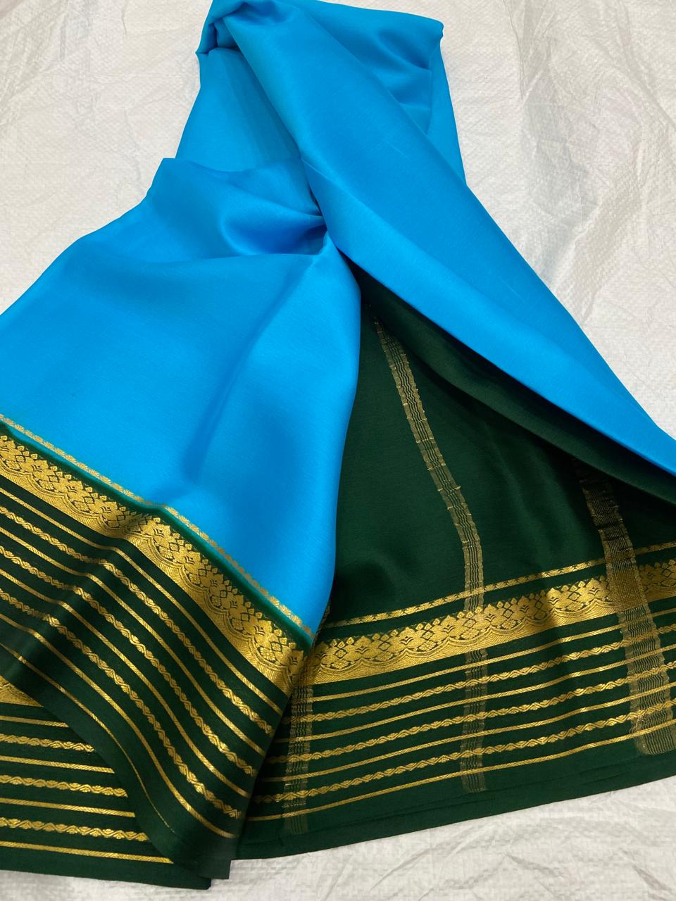 Blue and green saree with gold border Pure Mysore Crepe Silk Saree