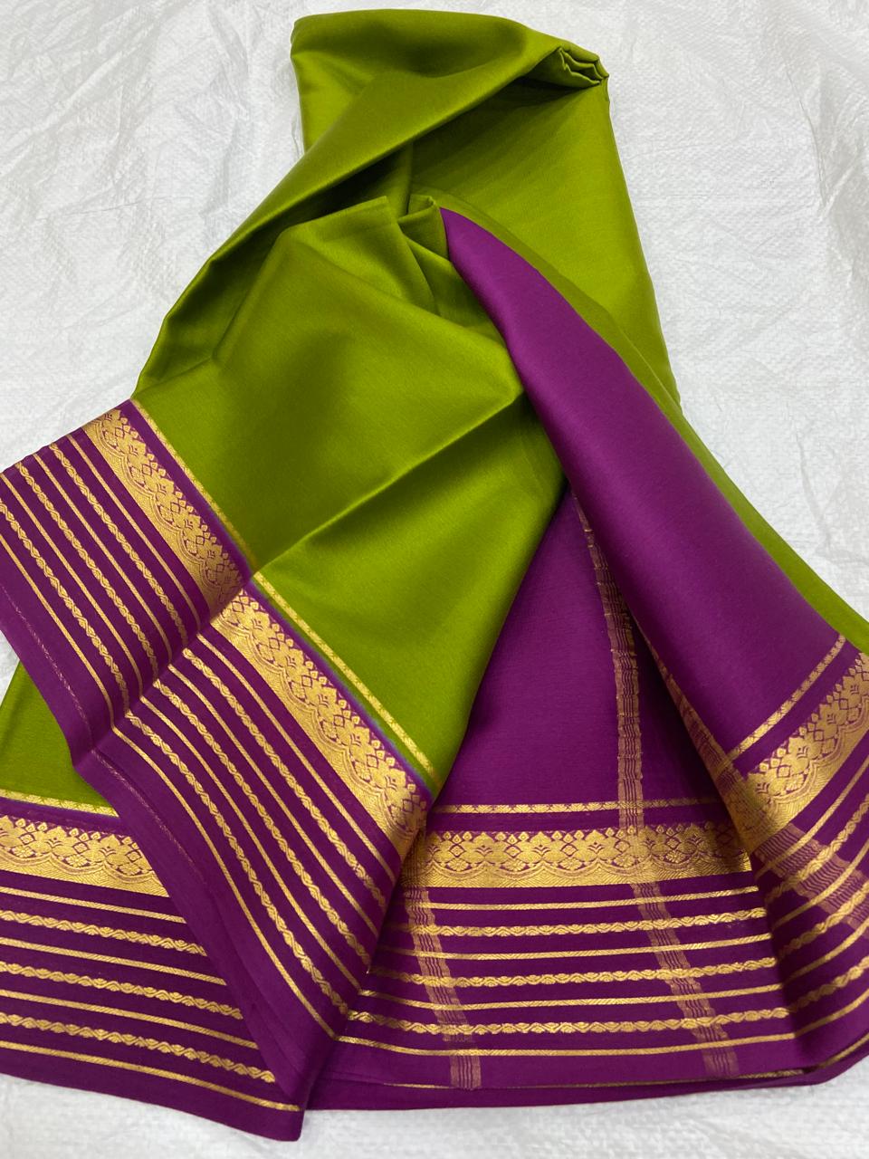 Embrace Heritage with a Modern Flair: The Green and purple saree with gold border Pure Mysore/Crepe Silk Saree