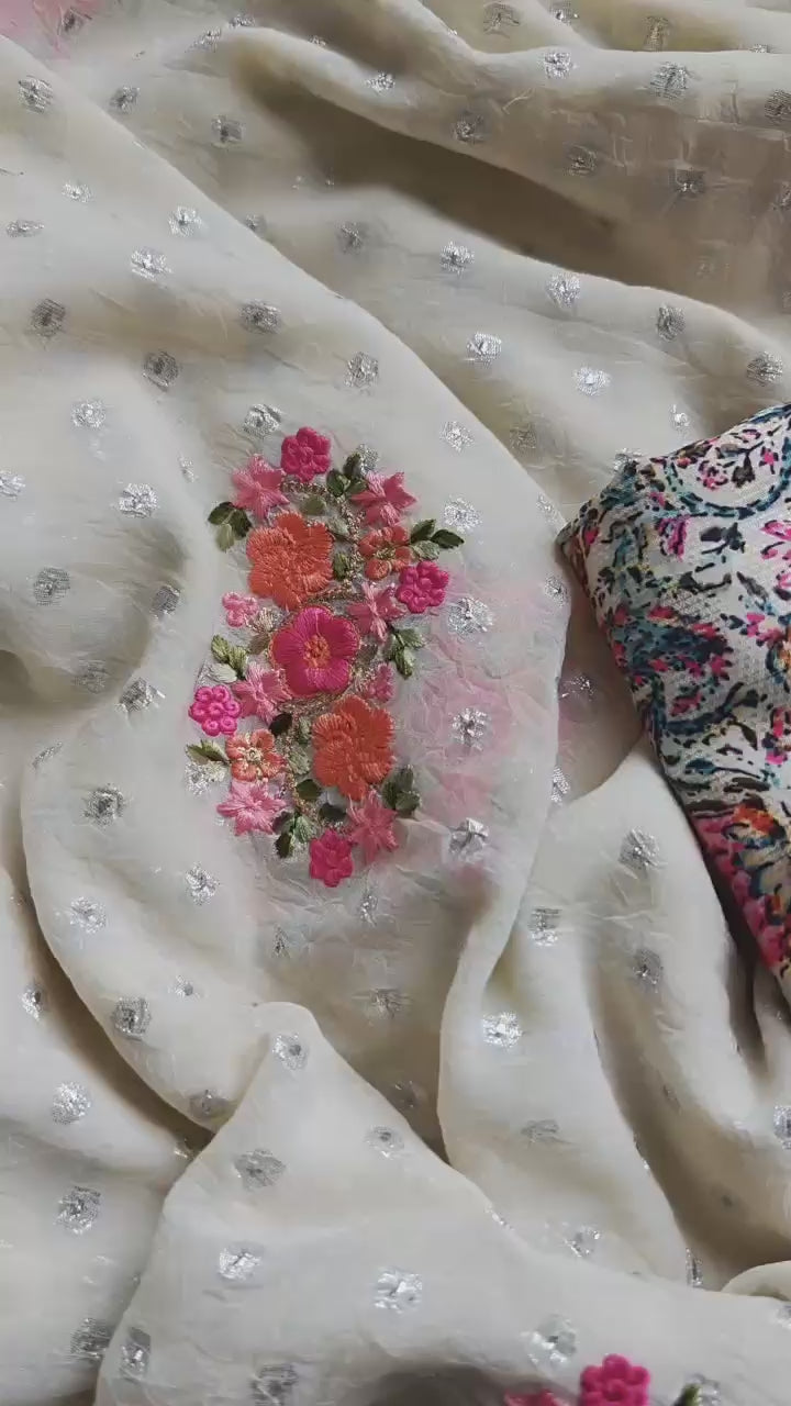 Drape yourself in luxury with German chiffon sarees, graced by intricate floral thread embroidery, delicate silver lace, and shimmering silver Zari Butti work throughout. Each piece is paired with a striking contrast printed silk blouse that elevates the ensemble to a whole new level.