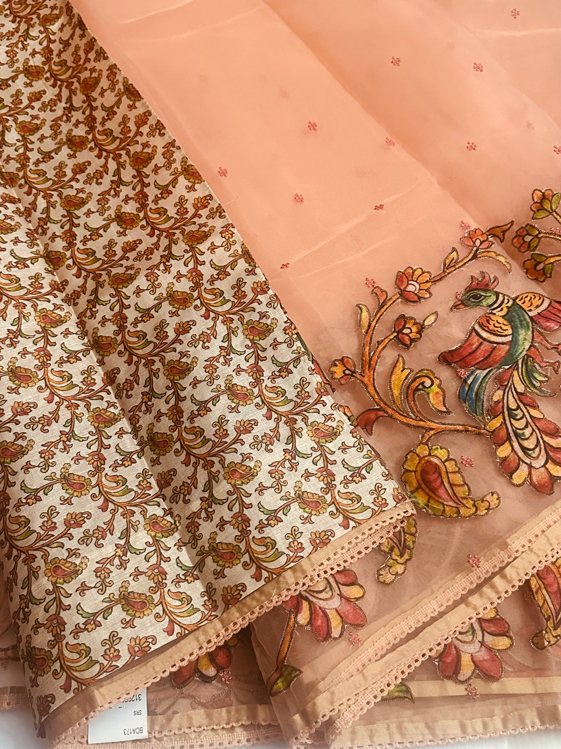 Beautiful Light Weight Baby Orange Organza saree, Adorned with Intricate Kalamkari Patchwork Along The Border.