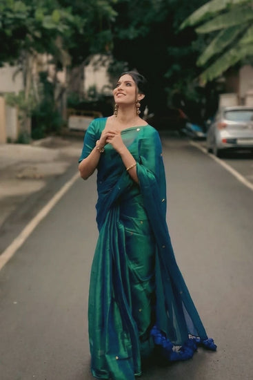 Step into timeless elegance with our Soft Tissue Royal Silk Saree, a masterpiece that blends tradition with modern grace. Crafted from premium silk fabric, this saree features a mesmerising dual-tone and is perfectly complemented by delicate golden thread accents.
