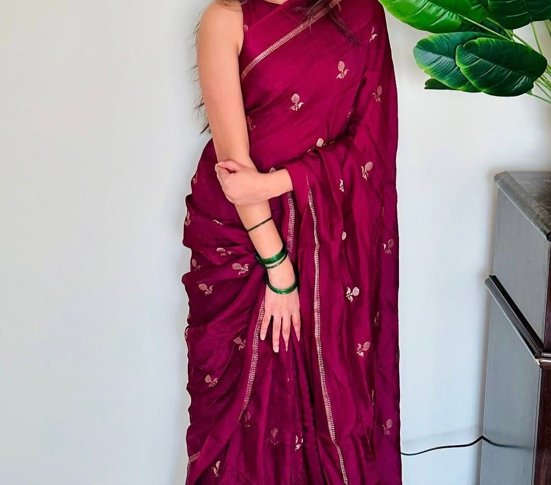 Elevate your style with a Pure Soft Viscose Khadi Silk Saree, adorned with jacquard leaf motifs & satin border—perfect for parties & weddings.