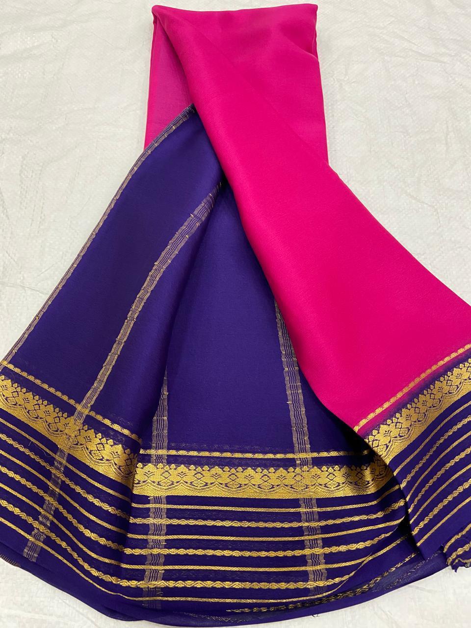 This stunning Sixty Counts Pure Mysore / Crepe Silk Saree comes in a bold pink body contrasted beautifully with a Navy-blue pallu and blouse, creating a striking color harmony.