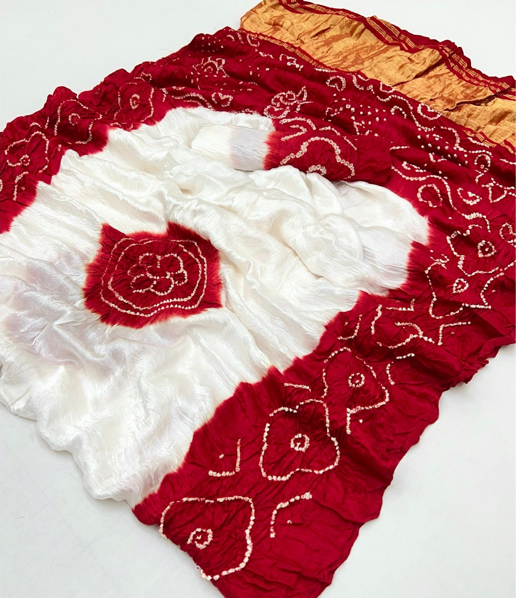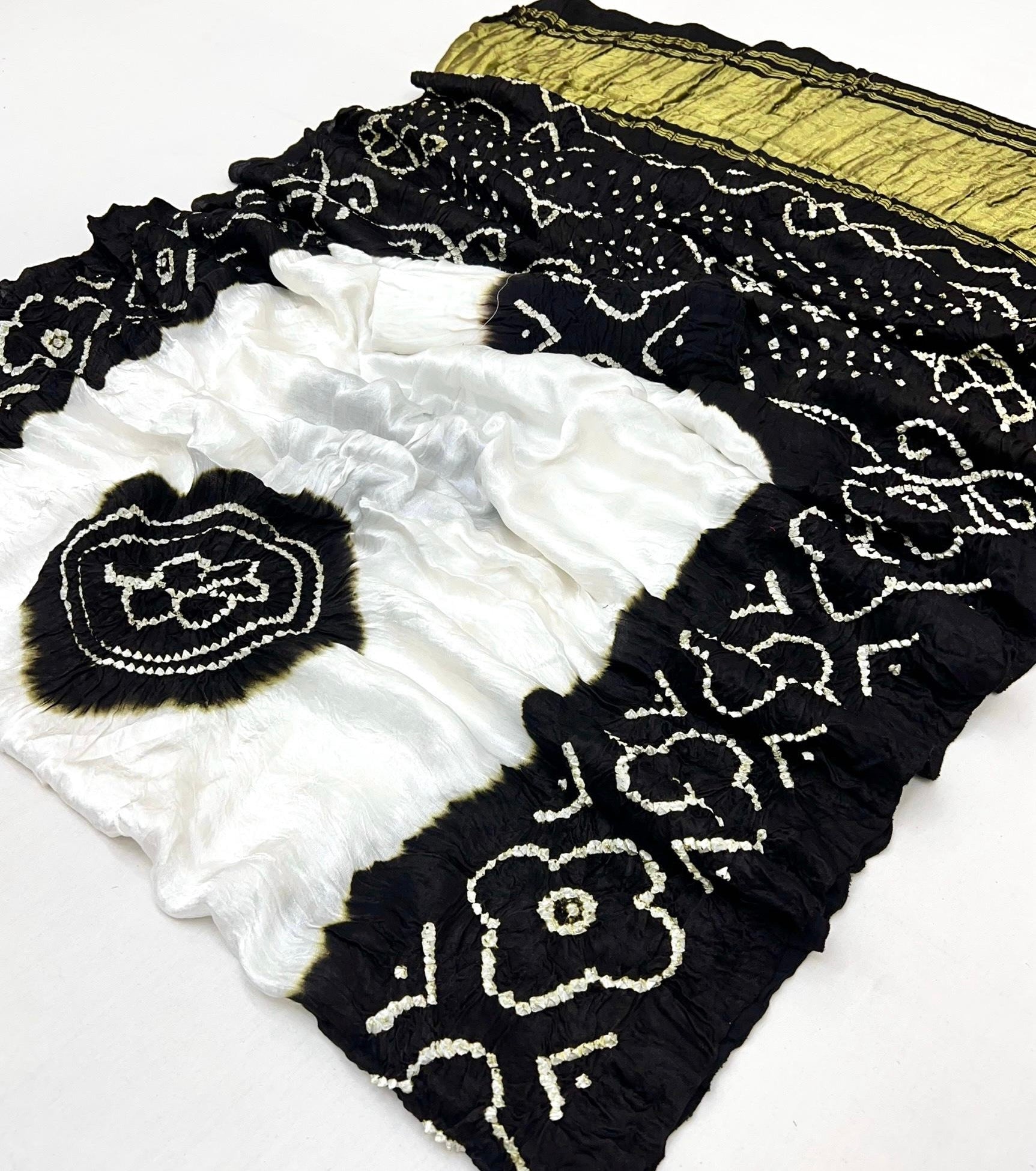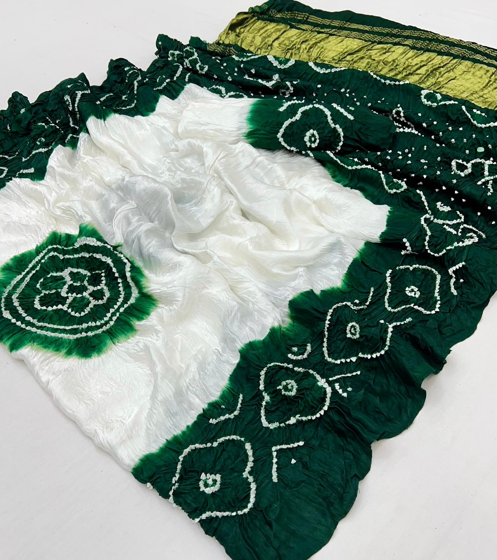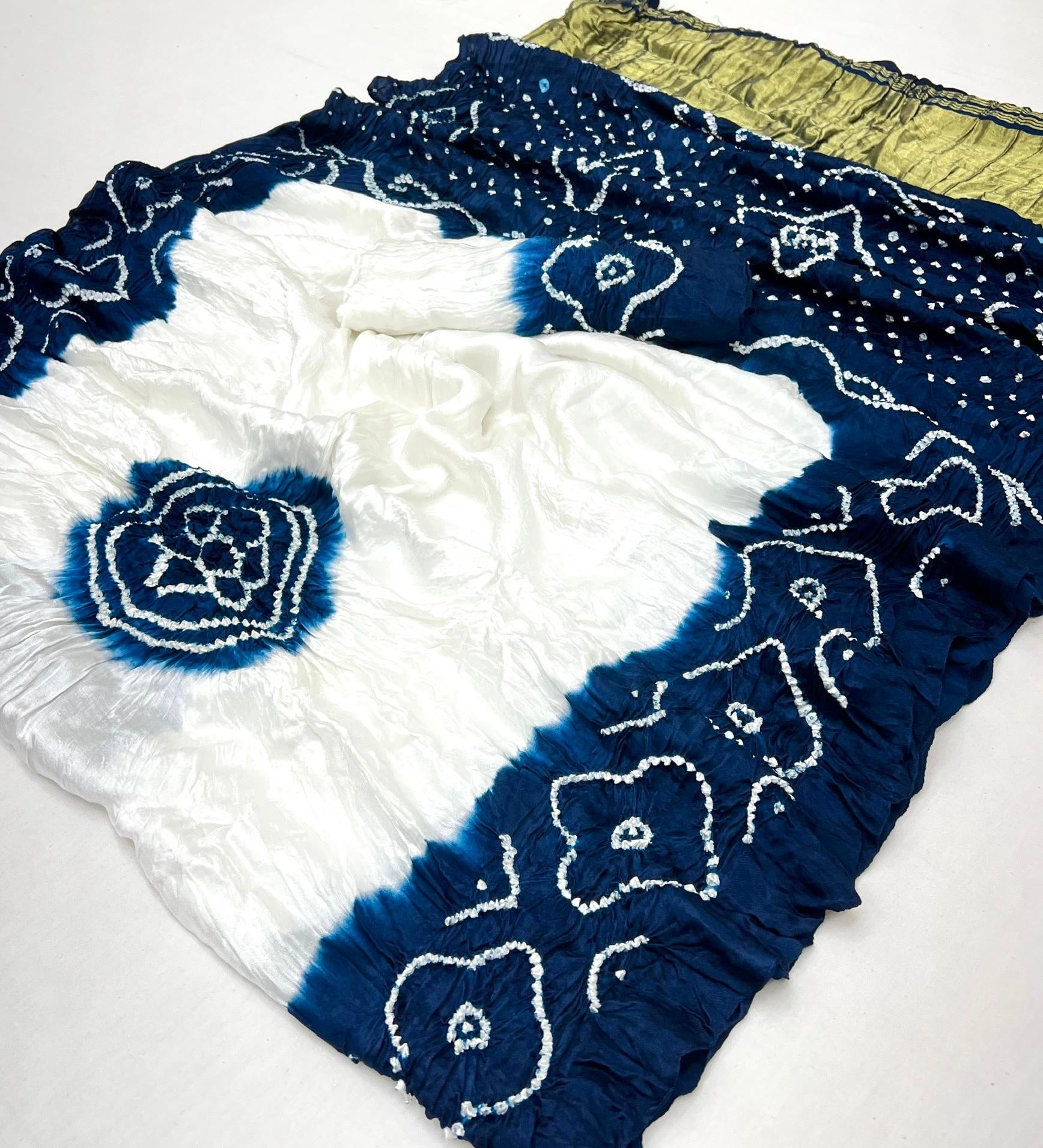 Luxurious Gajji silk saree adorned with vibrant contrast Bandhani patterns, ideal for festive and special occasions.